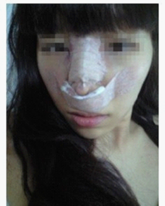 鼻子手术后当天的样子。我做的是全身麻醉。用自己的鼻中隔软骨垫的鼻尖。那天实在是狼狈+丑可以形容,之后那就是更丑、、、